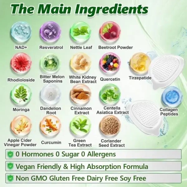Apple cider vinegar powder, white kidney bean extract, and cinnamon extract work synergistically on carbohydrate metabolism and gut motility by reducing digestive enzyme activity and supporting hepatic and biliary detoxification and bile flowโpromoting fat digestion, nutrient absorption, and endotoxin clearance to maintain a more balanced intestinal environment. Moringa, green tea extract, and coriander seed extract, rich in natural polyphenols, help inhibit pathogenic bacteria, support the expansion of beneficial probiotics, and enhance microbiome diversity, improving bloating, irregular bowel movements, and overall digestive discomfort.